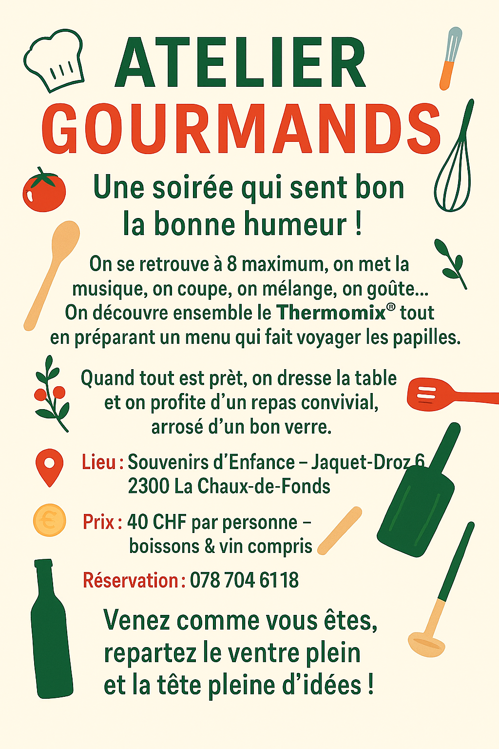 Bienvenue à l'Atelier Gourmands, où nous vous proposons une expérience culinaire unique en utilisant le Thermomix ® pour transformer vos ingrédients en délicieux repas faits maison. Parce que nous croyons que la nourriture est au cœur du bien-être, nous sommes déterminés à vous aider à prendre plaisir à cuisiner pour vous et vos proches.